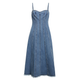 - Women's strapless denim maxi dress with button-up and raw-edge hem design