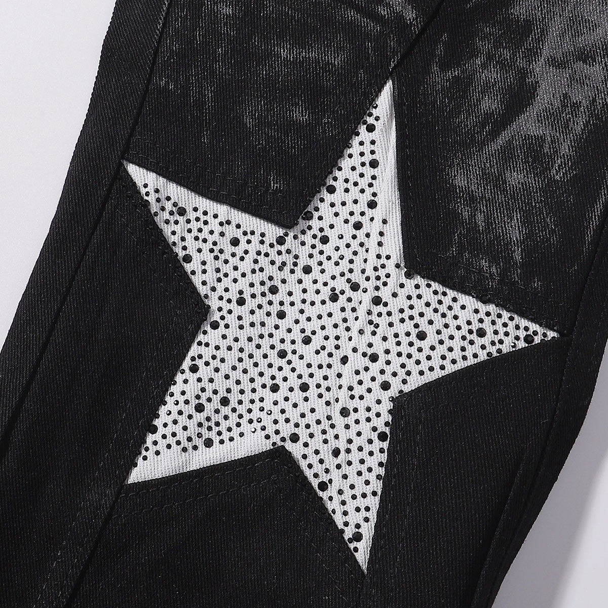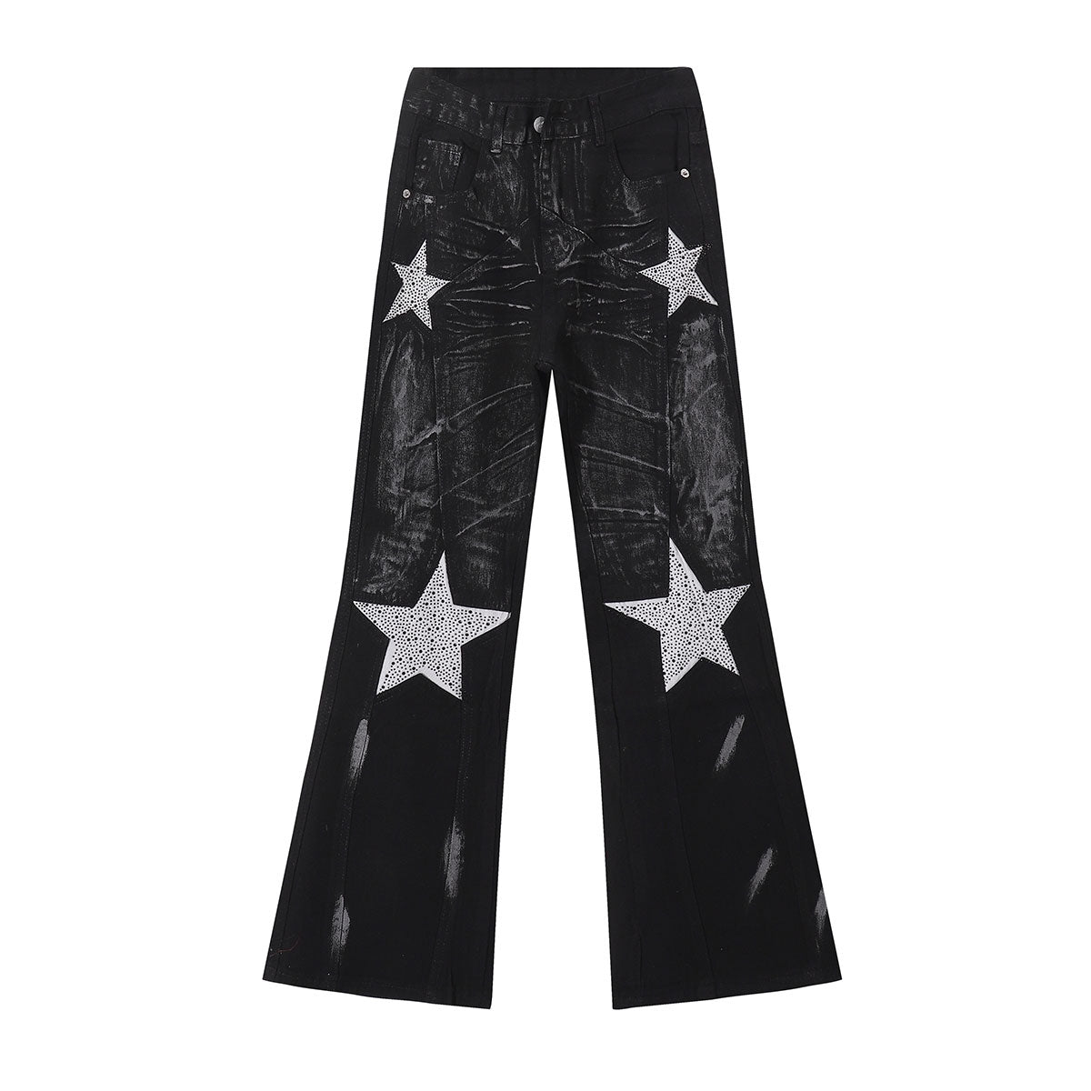 - Large star appliqués with rhinestone detailing on the front legs, adding sparkle and visual interest
