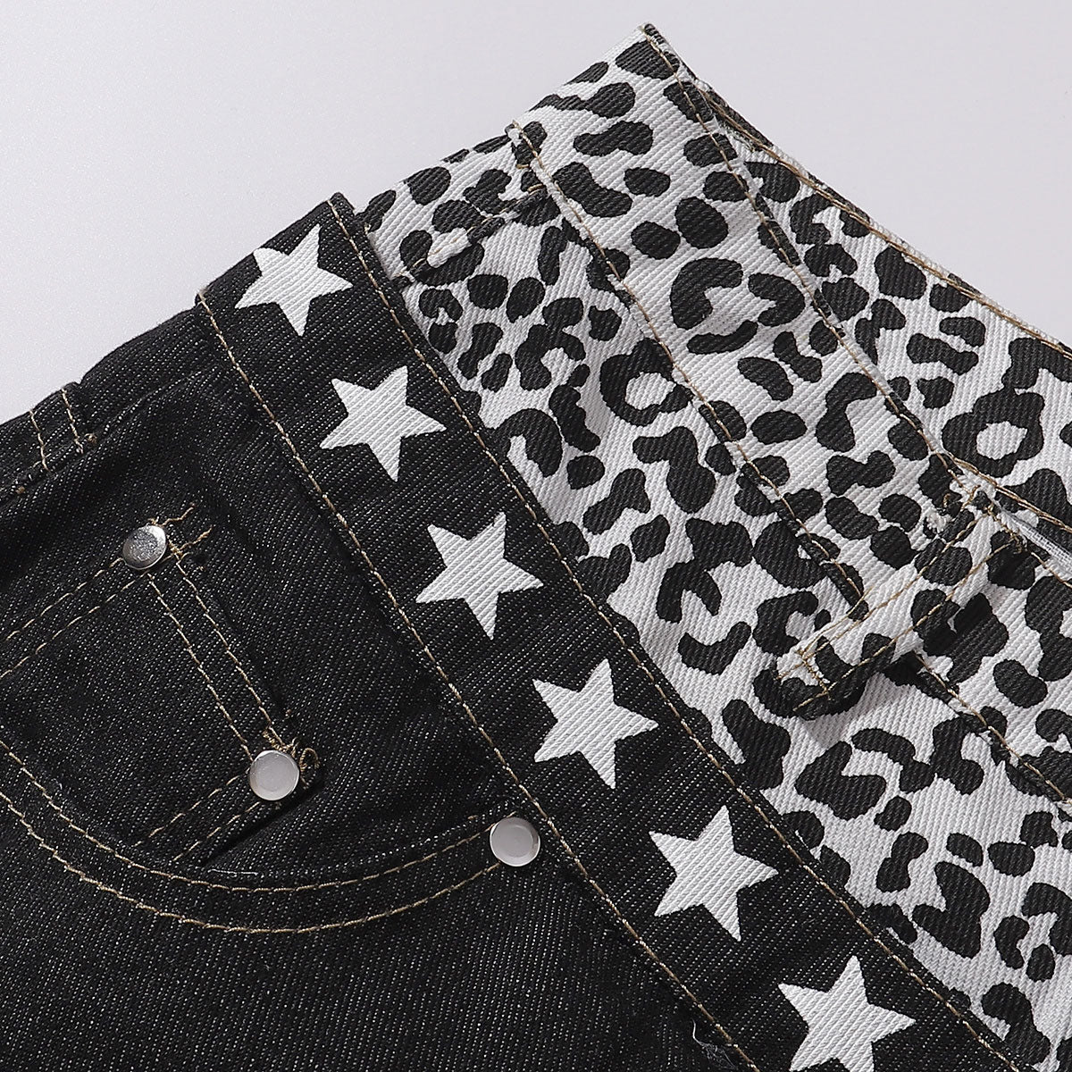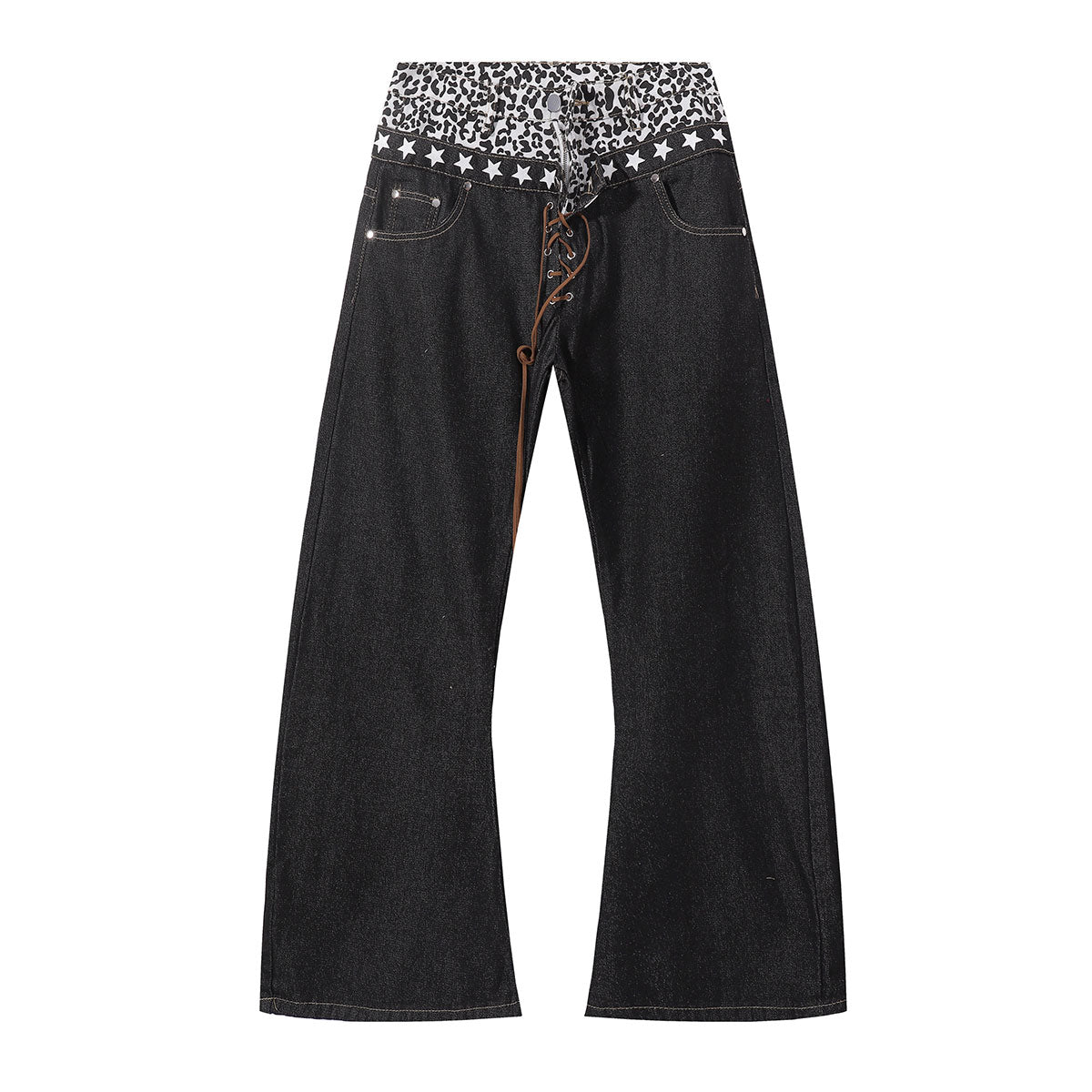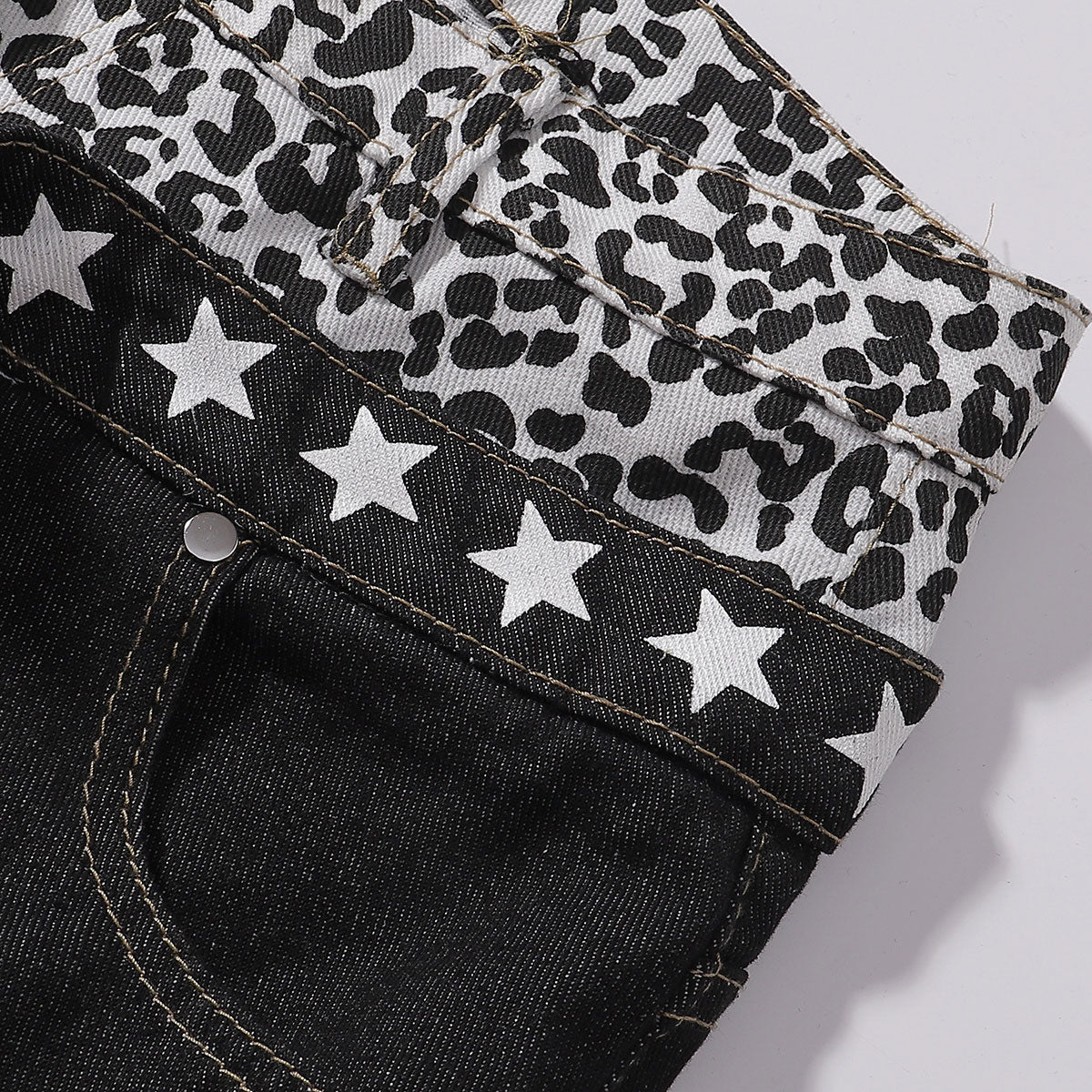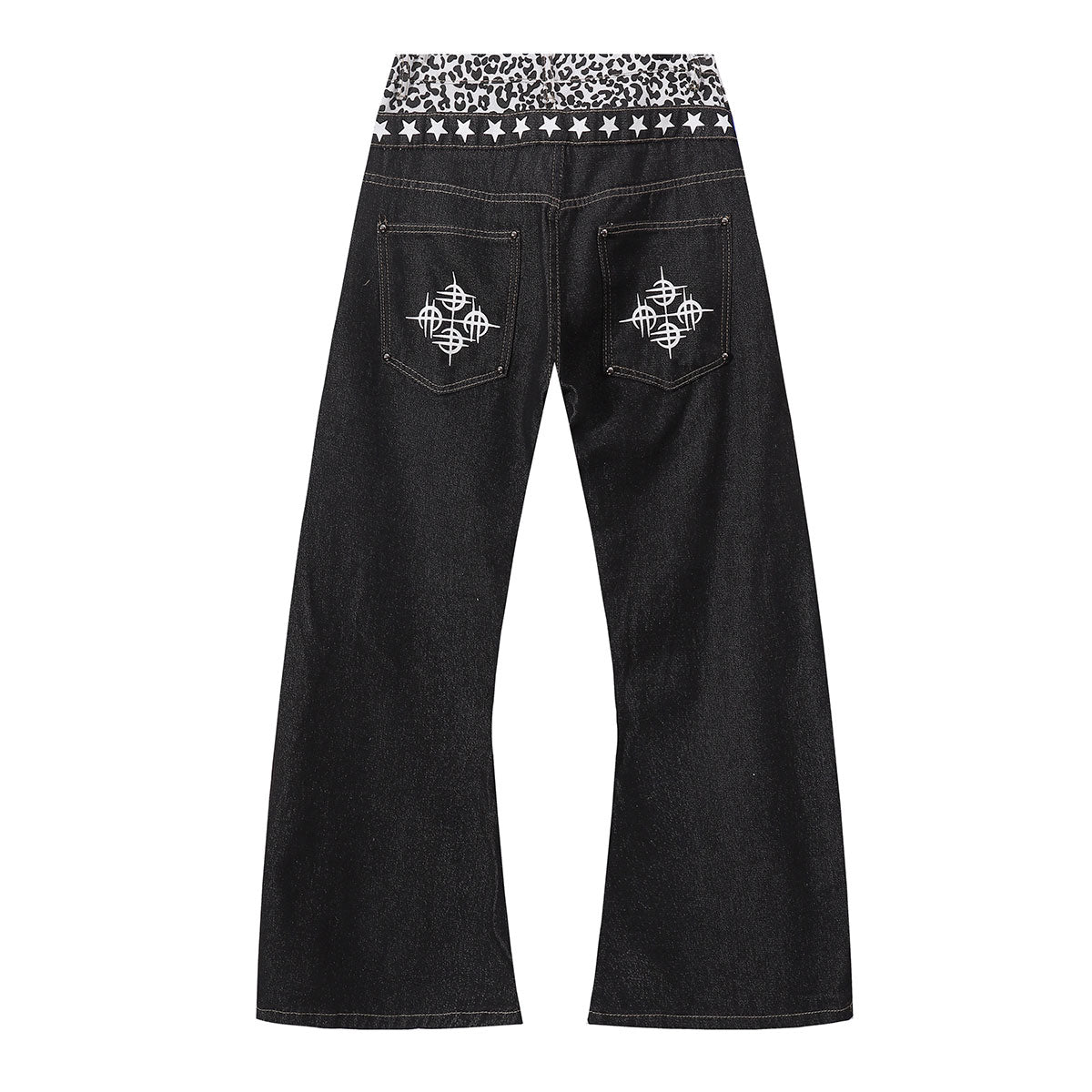 • High-waisted pants featuring a bold star print on the waistband for a unique and trendy look