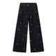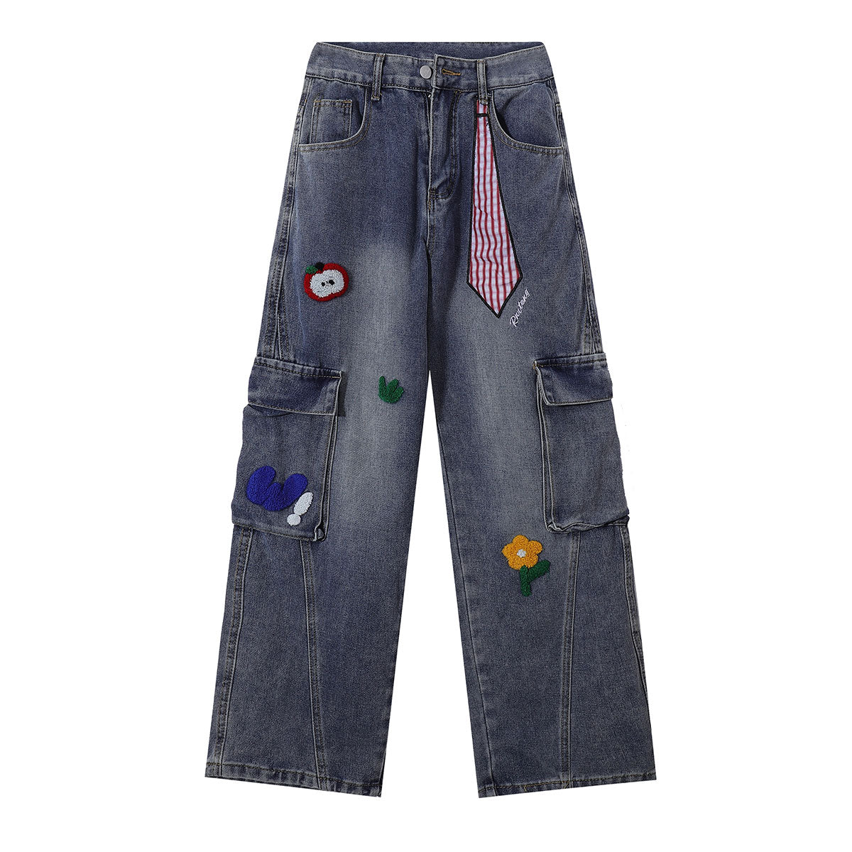 - Features playful embroidered patches, including a colorful apple, flowers, hearts, and a striped fabric detail on the waistband