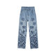- Asymmetric baggy jeans, Chinese pearl frog closures & lace embroidery details