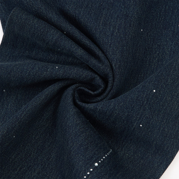 - Minimalist dark denim enhanced with subtle rhinestone embellishments