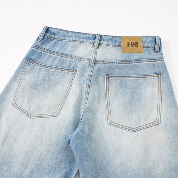- Classic faded blue denim with subtle lightening along the thighs and legs for a timeless