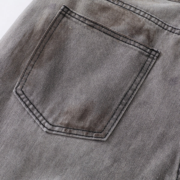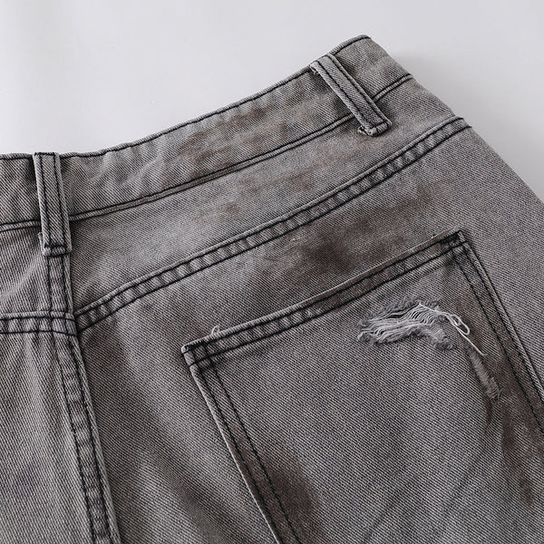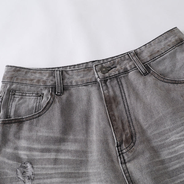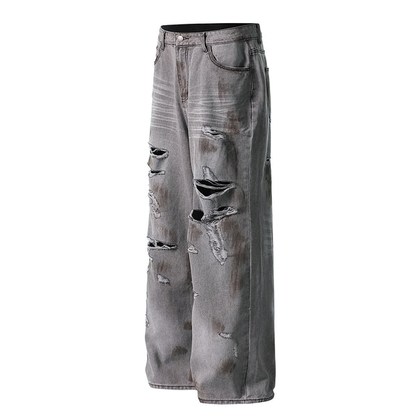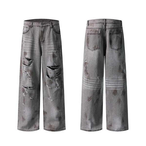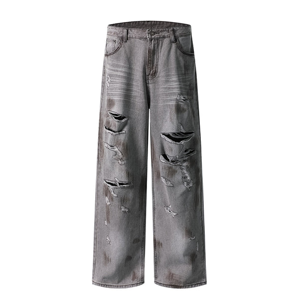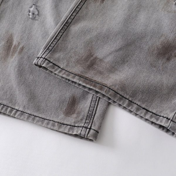- Intentionally distressed with multiple rips and faded patches