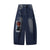 - Y2K distressed jeans: barrel leg with playful cartoon patches