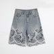- Pearl-embellished asymmetric denim shorts with deconstructed cut-outs