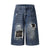 - Deconstructed denim shorts – grunge camo patches & raw rips