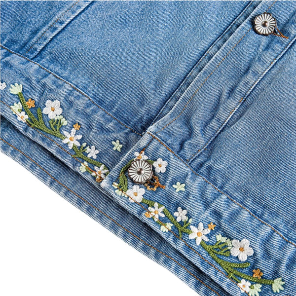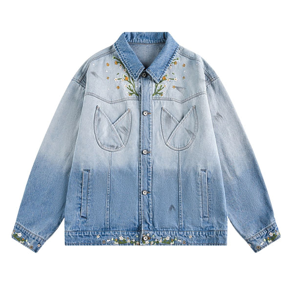 Men&Women's Retro Washed Gradient Floral Embroidered Denim Jacket