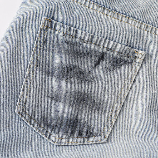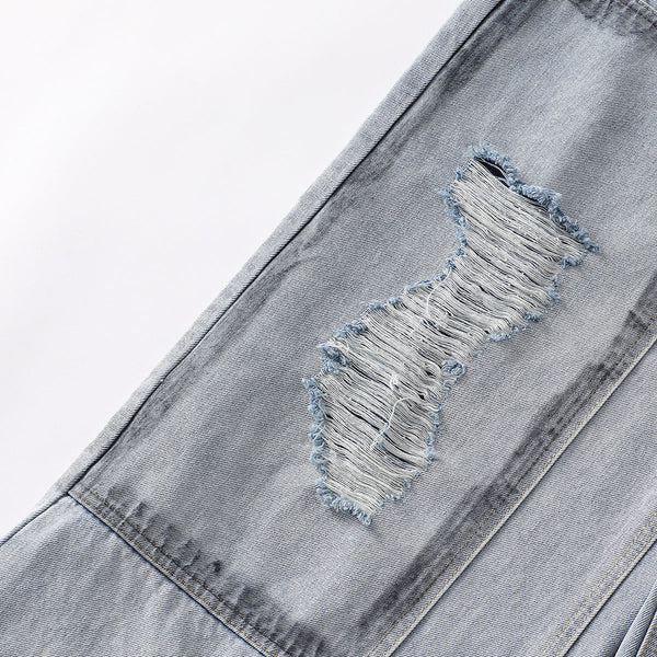 - Unique panel-style patchwork on lower legs with large distressed rips