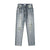 - Asymmetrically distressed front panels with organic rips